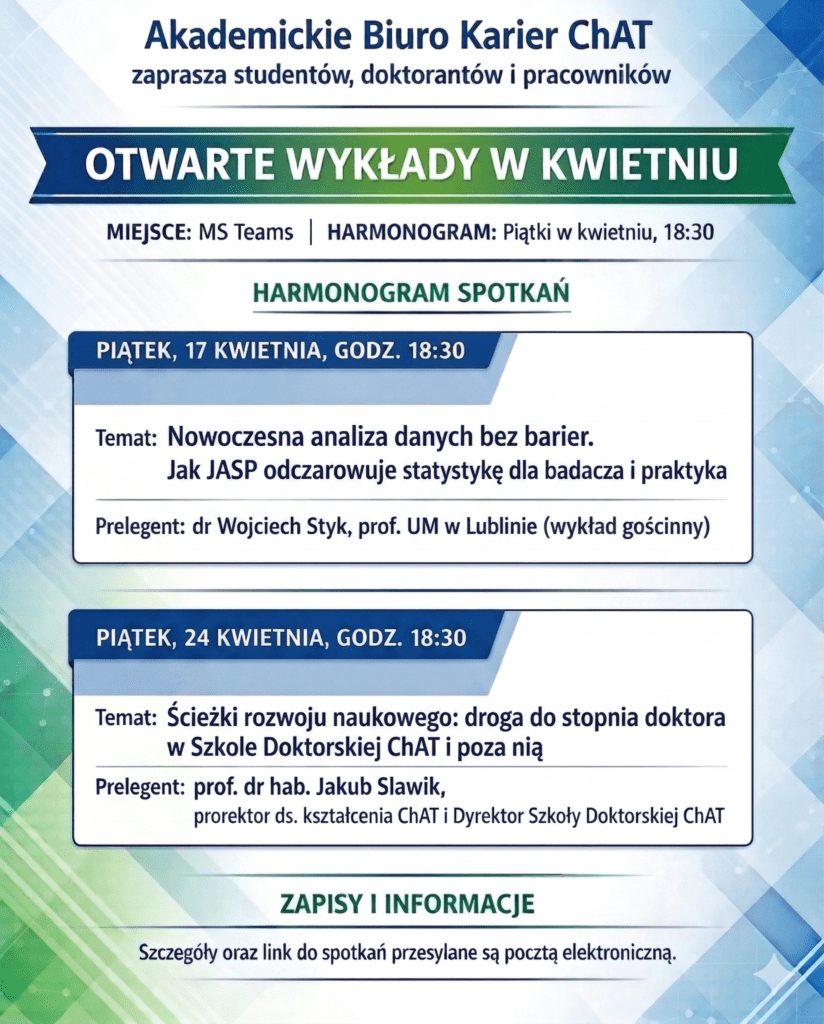 - 24 kwietnia, godz. 18:30, Ścieżki rozwoju naukowego: droga do stopnia doktora w Szkole Doktorskiej ChAT i poza nią.